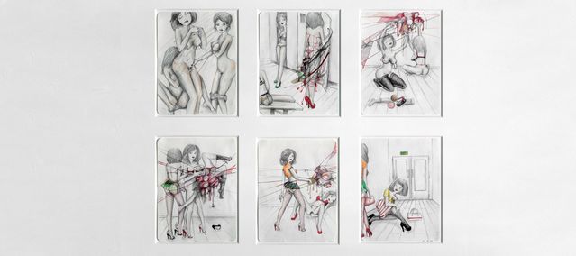 6 drawings each: 20.6 x 15.8 cm 6 drawings each: 8 1/8 x 6 1/8 in. Overall framed: 64 x 73 cm (25 1/5 x 28 3/4 in.)