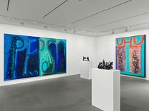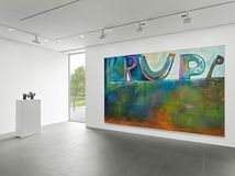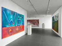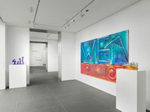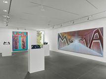 This summer, Galerie Andrea Caratsch presents a group of paintings and sculptures created by Czech born artist Dokoupil. The works are a selection of a closed series titled Corporations & Products, created between 1985 and 1986 in Cologne, of which a comprehensive group was presented at the Rio de Janeiro Biennale in the fall of 1985. Large-scale dynamic paintings and cranky bronze sculptures featuring names of global corporations such as Pepsi, but also names of German companies having emerged from the context of the much cited Deutsches Wirtschaftswunder and institutions such as MOMA ironically become the subjects of his artistic preoccupation. The anti-aesthetic, rough surfaces and the spirit of these works convey at best the rebellious and punk attitude of Dokoupil in these seminal years of his career.